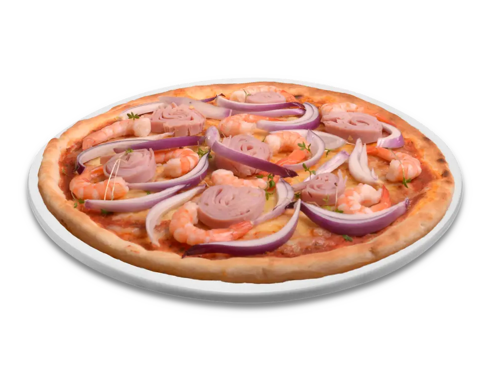 Frischer Teig, Tomatensauce, echter Käse, Knoblauch, Thunfisch, Shrimps, Zwiebeln